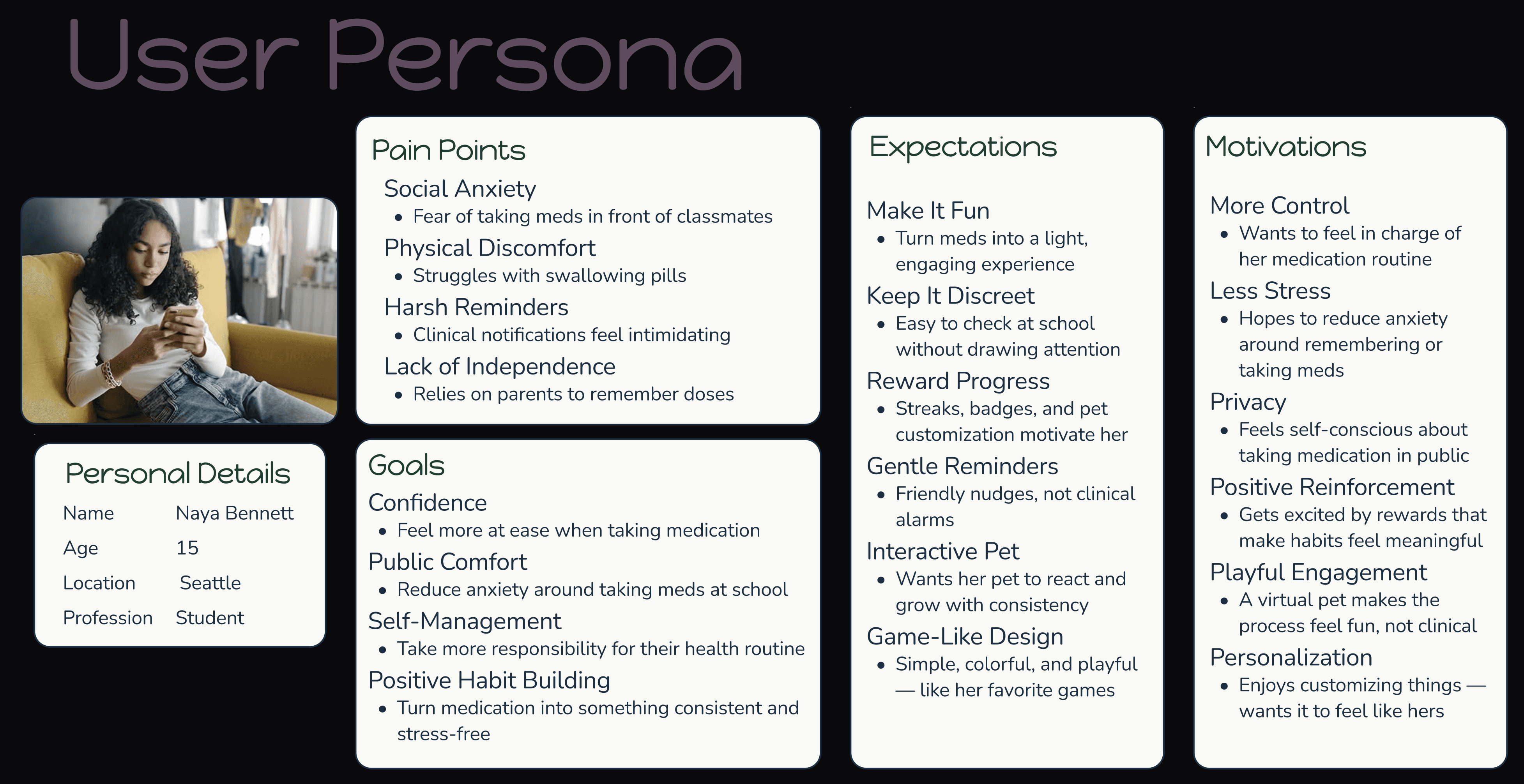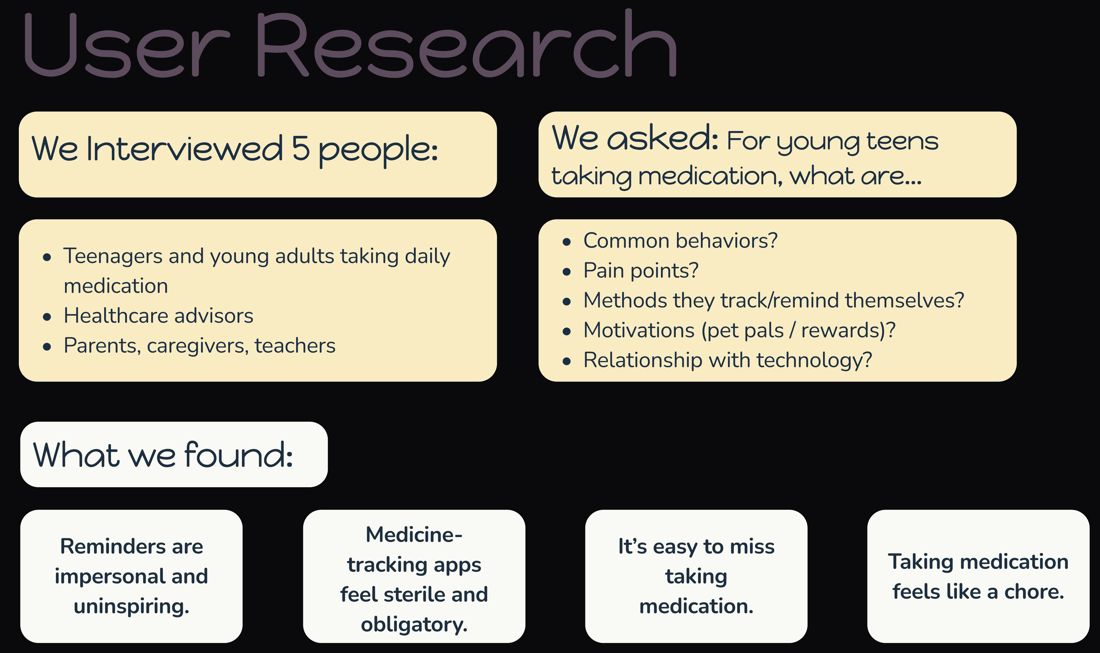 We believe that an interactive virtual companion and progress tracking will create a more engaging and supportive experience for teenagers and will lead to long-term consistency and make taking medication feel less like a chore.