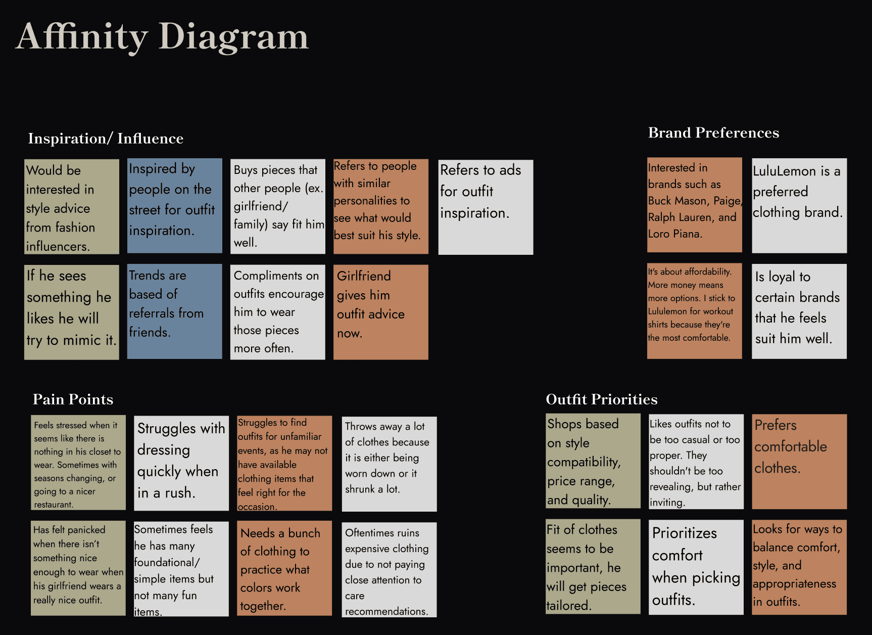 Sees dressing as something that he has to do, he isnโt overly interested in his personal style. He aspires to develop a personal style and feel put together, but has difficulty picking out cohesive and stylish outfits.